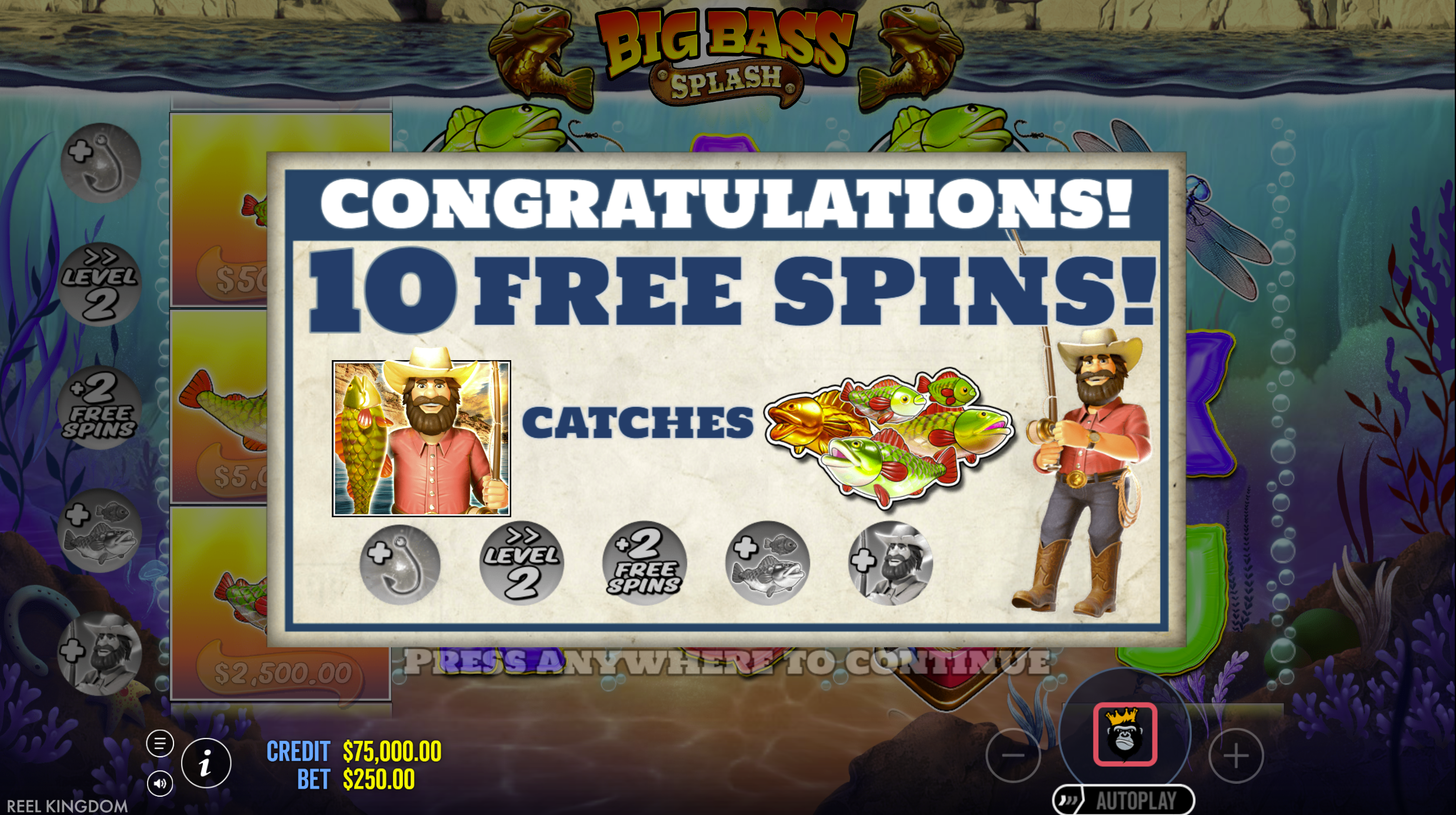 • Money Symbols (Fish with cash values): These can appear during both base game and free spins. In the bonus round, if a fisherman wild lands, it collects visible money values for cash prizes. :contentReference[oaicite:11]{index=11}