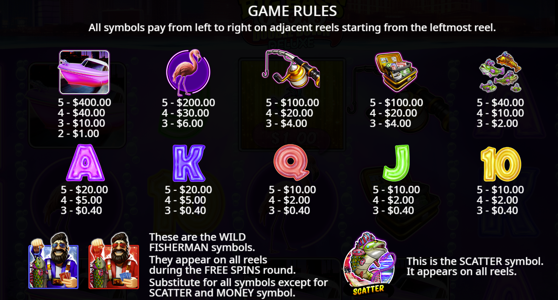 - Wild Symbol Fisherman: This symbol substitutes for other symbols (except scatter) to help complete wins. During Free Spins, the fisherman has an additional role of collecting money-symbol values currently on the reels. :contentReference[oaicite:9]{index=9}